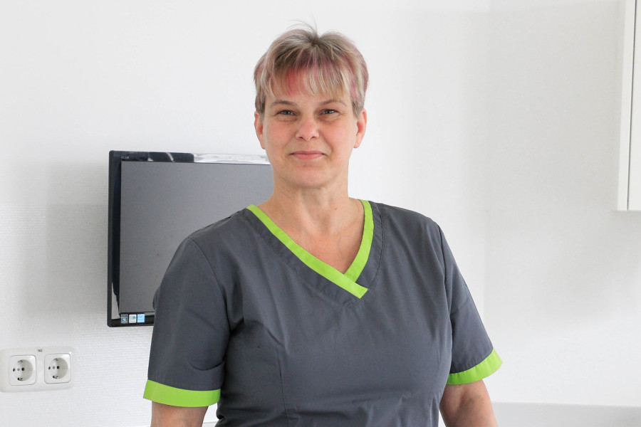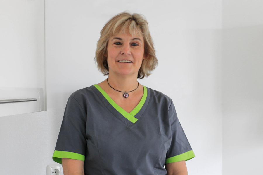 Petra Isserstedt assistiert im Behandlungszimmer und besitzt die Zusatzausbildung, um selbstständig professionelle Zahnreinigungen durchzuführen.